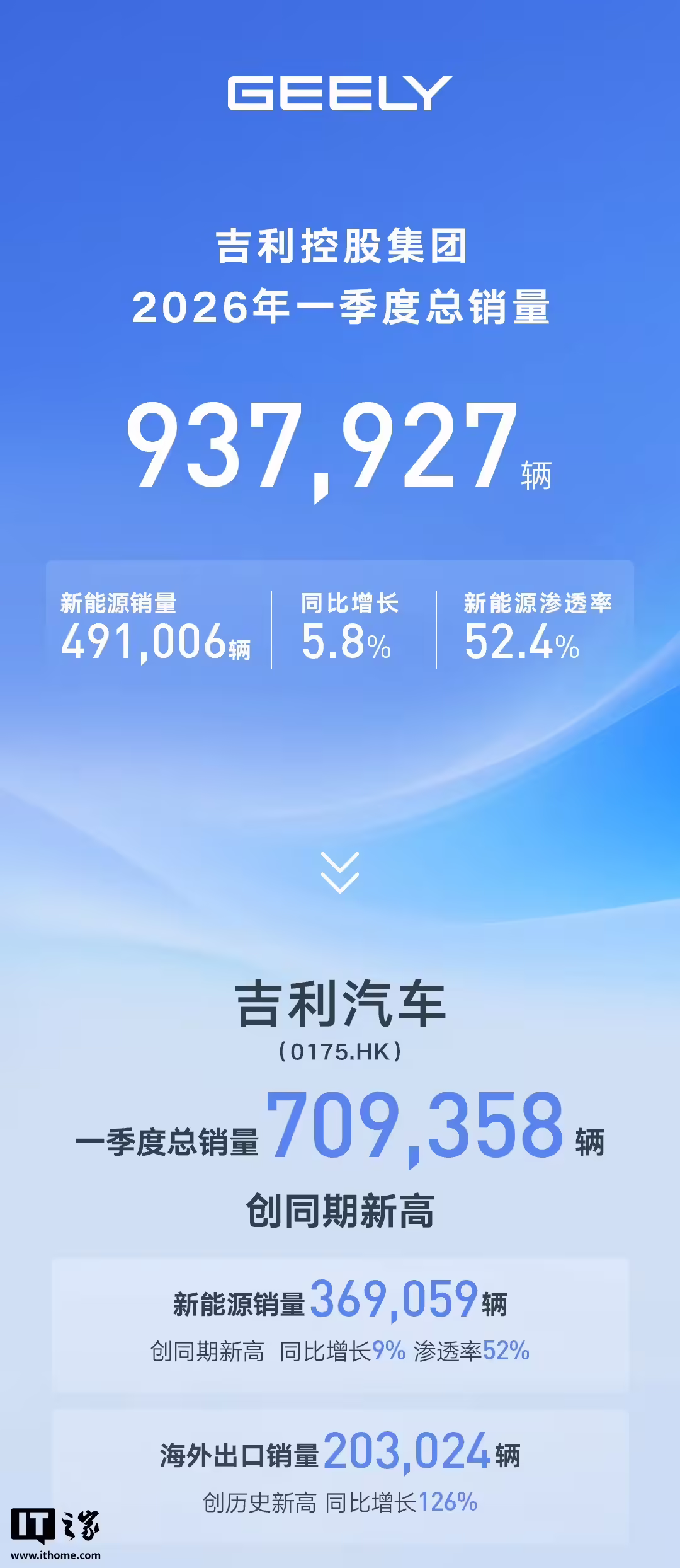 吉利控股集团今日发布了 2026 年第一季度总销量: