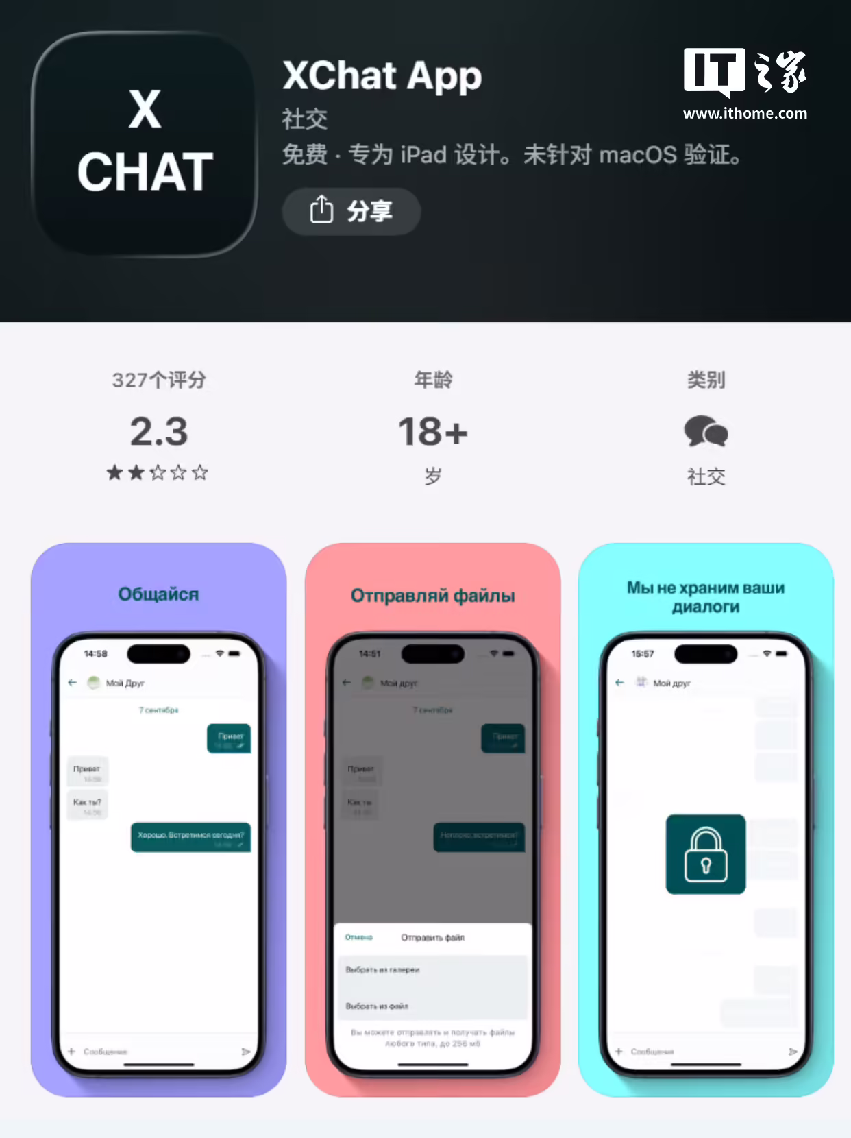 IT之家查询这款名为“XChat App”的应用详情页发现,这款应用同样是主打隐私,应用介绍和更新日志都是俄语,宣称是一款免费应用和安全消息传递工具,每 30 天自动删除所有用户的聊天记录,且不提供截图功能和麦克风、摄像头的访问权限。