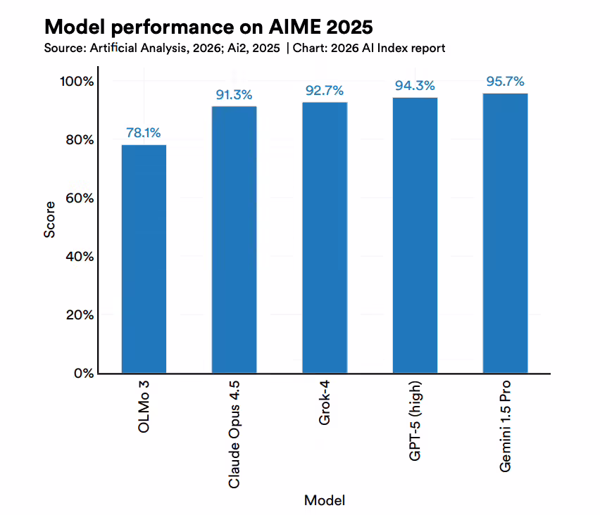 报告还指出,AI 的进化不仅没有遭遇所谓的「瓶颈」,反而正以史无前例的速度狂飙。过去一年,全球超 90% 的顶尖模型,在博士级科学问题、多模态推理、竞赛数学上的表现,追平甚至超越了人类。