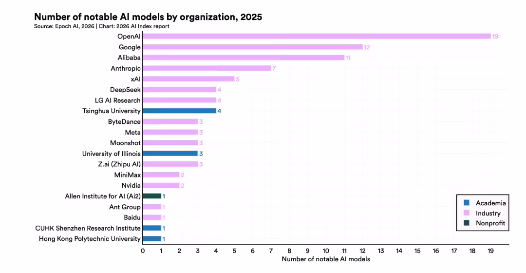 去年发布的 95 个最具代表性的模型里,超过九成都来自产业界,不是学术机构,也不是政府实验室。学术界已经追不上前沿了。
