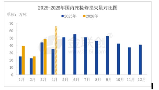 据金联创数据统计,4月国内聚乙烯检修损失量预计达66万吨,较3月(48.27万吨)环比增长36.73%,刷新历史同期最高纪录。