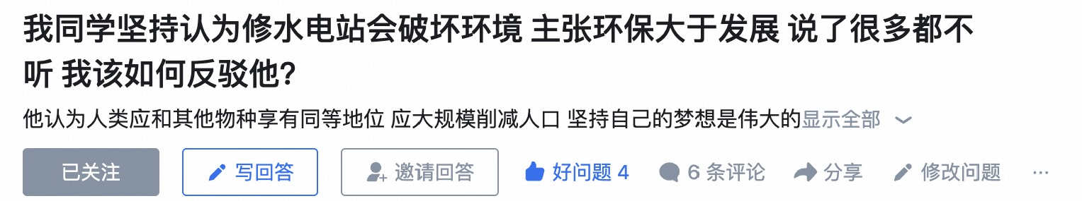 “我同学一直坚持修水电站会破坏环境,还说环保必须大于发展,我跟他说再多都不听,该怎么反驳?”