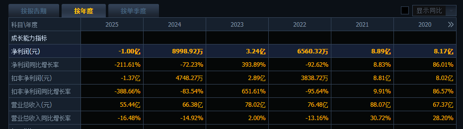 到了2025年,公司营收已收缩至55.44亿元,连续双位数下跌,滑落至2021年的六成左右。