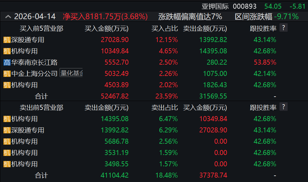 又是“小作文”惹的祸!4月14日,全球钾肥龙头亚钾国际开盘后股价一路下跌,尾盘一度跌停,收跌9.71%,创出天量成交。盘后龙虎榜显示,机构展开了激烈的多空对决,北向资金日内大举做T。