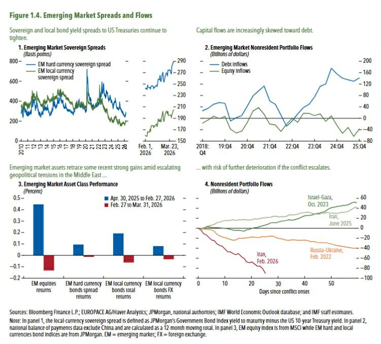 “与冲突相关的消息在升级和降级之间摇摆不定,包括最近为期两周的停火。这种起伏导致能源价格和资产价格出现波动,但尚未引发持续的市场下跌,从而导致严重的流动性压力、追加保证金和强制去杠杆化。不确定性很高,但结果并未导致投资者无序撤离。”IMF写道,“更广泛地说,历史经验表明,地缘政治风险对全球资产价格的影响往往有限且短暂。最近,这一历史经验再次得到证实,尤其是在发达经济体,股票和债券市场虽已调整,但并未出现动荡。新兴市场对全球风险情绪的变化更为敏感,这反映出它们更容易受到波动性资本流动和风险敏感型投资者的影响。”