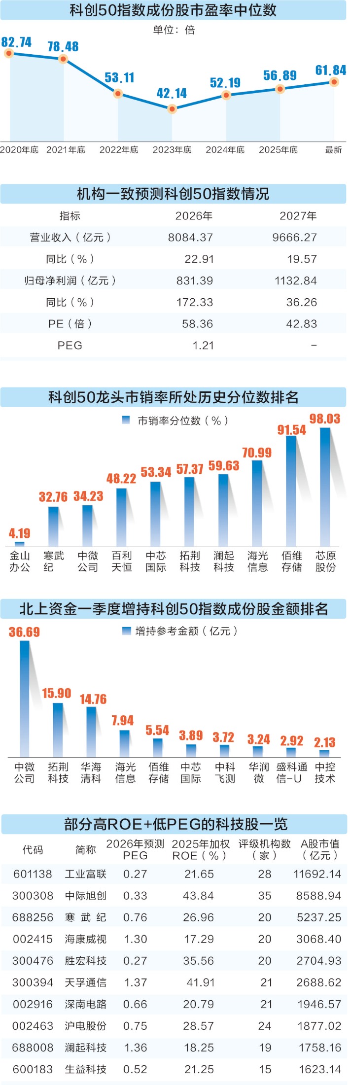 当前,以“人工智能+”为代表的部分科技股股价频创新高,市场普遍认为相关公司估值较高。与此同时,部分半导体企业净利润实现显著增长,北上资金一季度也增持科创50指数成份股。因此,对科技股的估值需结合静态水平与动态变化进行评估。