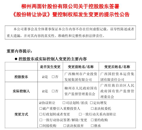主业承压的同时,两面针正面临易主。4月1日,两面针发布公告,宣布控股股东、实控人拟发生变更,控股股东由柳州产投变更为广西国控,实际控制人则由柳州市人民政府国有资产监督管理委员会变更为广西壮族自治区人民政府国有资产监督管理委员会。