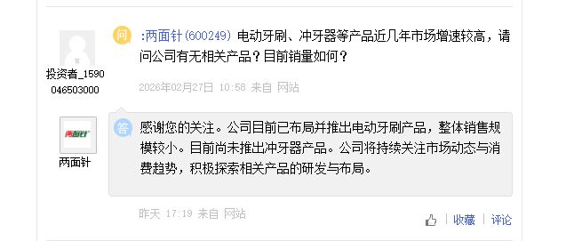 4月13日,针对投资者关于电动牙刷、冲牙器等产品的布局,两面针在互动平台回应称,“公司目前已布局并推出电动牙刷产品,整体销售规模较小。目前尚未推出冲牙器产品。”