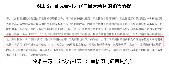 如图表2所示,以第一大客户回天新材(指湖北回天新材料股份有限公司及其合并范围内公司,下同)为例,金戈新材对其销售的高性价比产品占比超过95%,且金戈新材因客户采购量大而给予价格优惠,毛利率显著低于其他客户,导致金戈新材无法及时完全将成本上涨转嫁给客户。