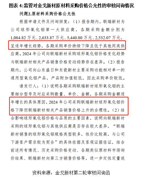 这本身倒不一定有问题,但第二轮问询函追问得更细:2024年金戈新材的采购价格下降,可联瑞新材自己的相关产品销售价格却在涨,第二轮问询回复显示,金戈新材核心原料球形氧化铝的采购价不仅持续低于其他供应商,还逐年下降,而该公司仅以“产品结构差异+战略采购量”来解释,却回避了2024年自身采购价下降与供应商联瑞新材同类产品售价上涨的直接矛盾,高毛利率真实性存疑。