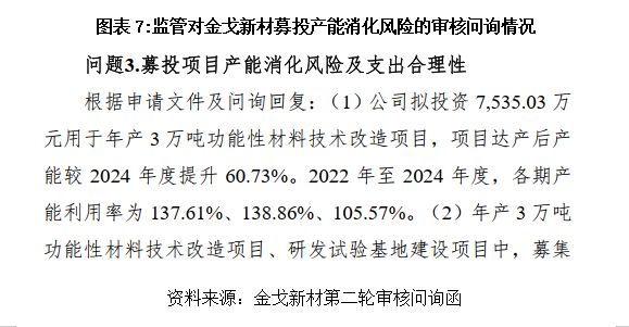 金戈新材这次IPO募投,核心项目之一是年产3万吨功能性材料技改项目,达产后产能提升60.73%。第一轮问询函显示,2024年金戈新材的总产能为4.94万吨,按这个算,新增产能确实不少。
