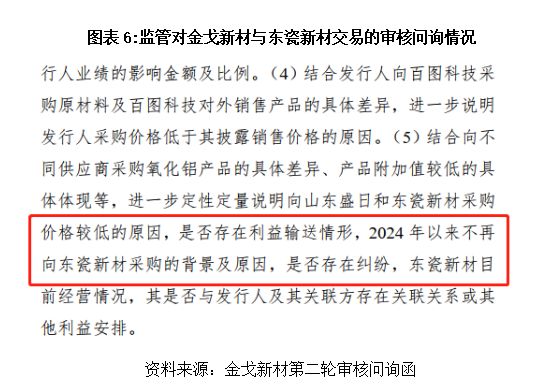 第一轮问询函还披露,如图表4所示,金戈新材向山东盛日(指山东盛日奥鹏环保科技有限公司及其合并范围内公司)和东瓷新材采购的通用型氧化铝,价格较低,理由是“产品附加值较低”。但2024年之后不再向东瓷新材采购,金戈新材在第二轮问询回复中表示自产半成品(型号CF59、CF51)在性能上接近且成本更低,因此主动终止合作,双方不存在纠纷。虽称无纠纷,但采购模式的变动进一步增加了供应链真实性的疑问。