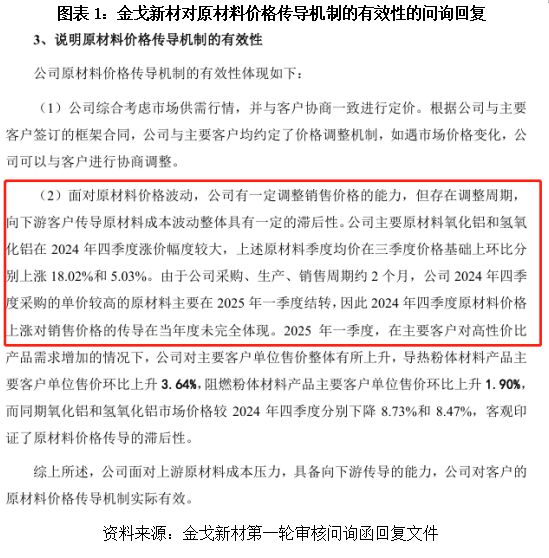 根据两轮问询回复内容,如图表1所示,金戈新材存在明显的价格传导滞后问题,2024年第四季度主要原材料氧化铝、氢氧化铝价格环比分别上涨18.02%和5.03%。但受2~3个月传导滞后期影响,且下游客户对高性价比产品的需求增加,主要客户压价明显。