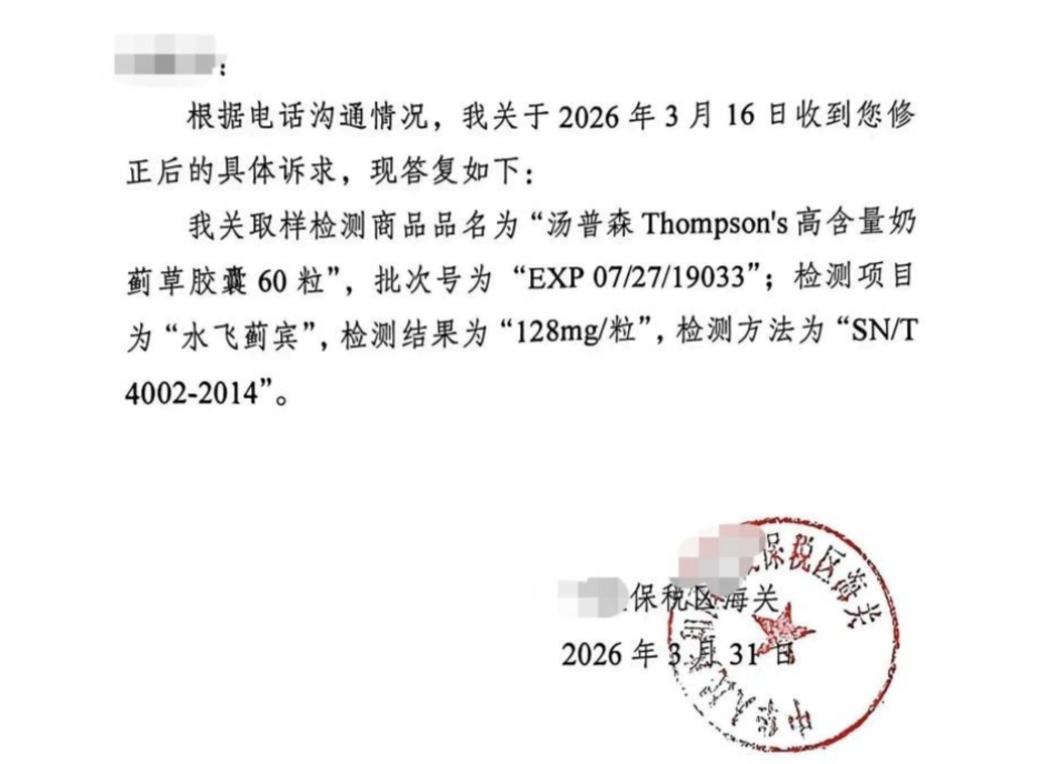 3月25日开始,记者多次联系汤普森海外旗舰店客服,反馈检测结果、询问实际含量。客服反复表示“产品经过澳大利亚药物管理局TGA审核”“含量与TAG注册配方一字不差”“从未接到过海关部门关于产品含量虚标的决定或通知”。
