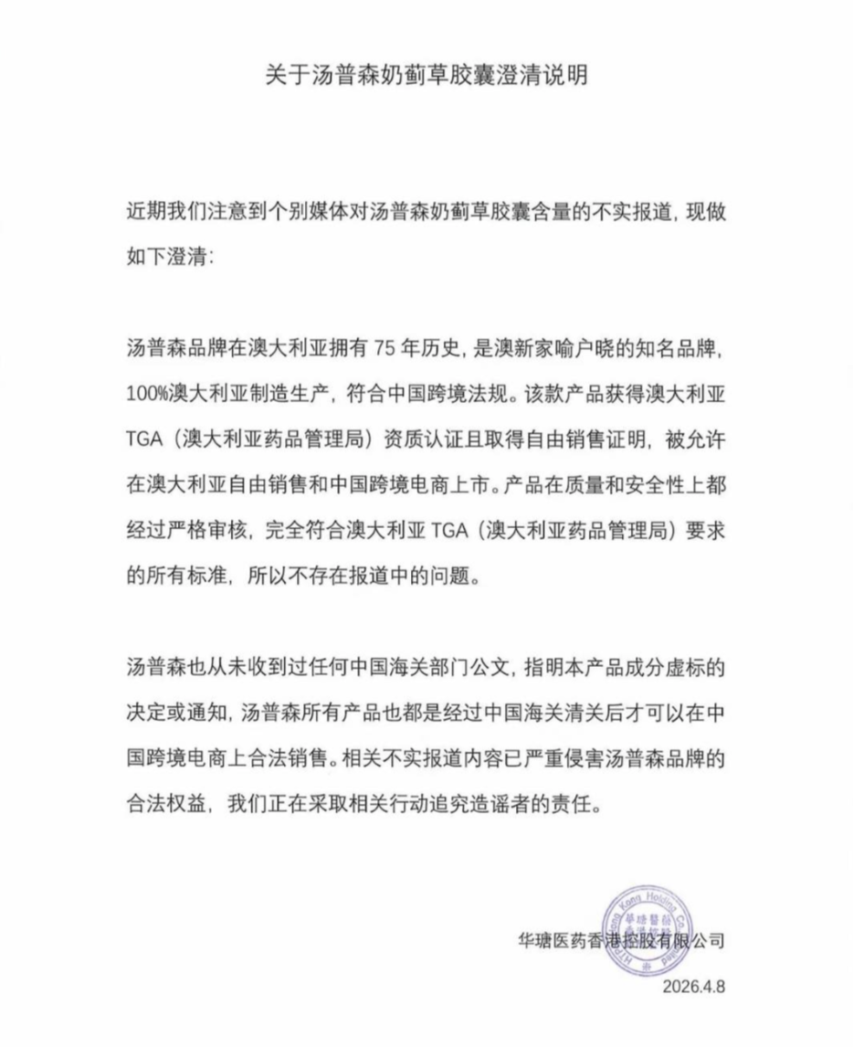4月8日,汤普森官方账号发布声明称,该品牌在澳大利亚拥有75年历史,是澳大利亚家喻户晓的知名品牌,产品100%在澳大利亚生产,符合中国跨境法规,不存在报道中的问题;汤普森从未接到过任何中国海关部门的公文,指明产品成分虚标的决定或通知;汤普森所有产品是经过中国海关清关后才可以在中国跨境电商上合法销售;相关不实报道严重侵害汤普森品牌合法权益,公司正在采取相关行动追究造谣者责任。