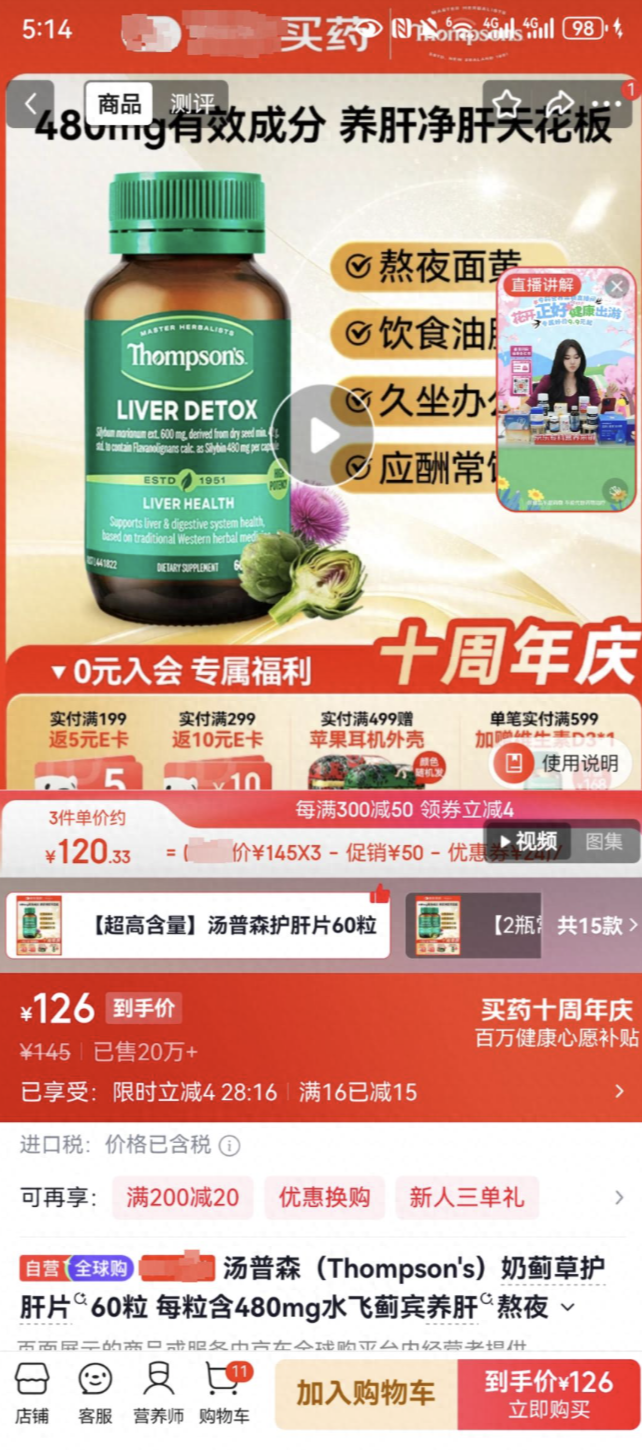 记者注意到,汤普森护肝片在某直播平台已全部下架,但在其他电商平台自营店、旗舰店还正常销售。