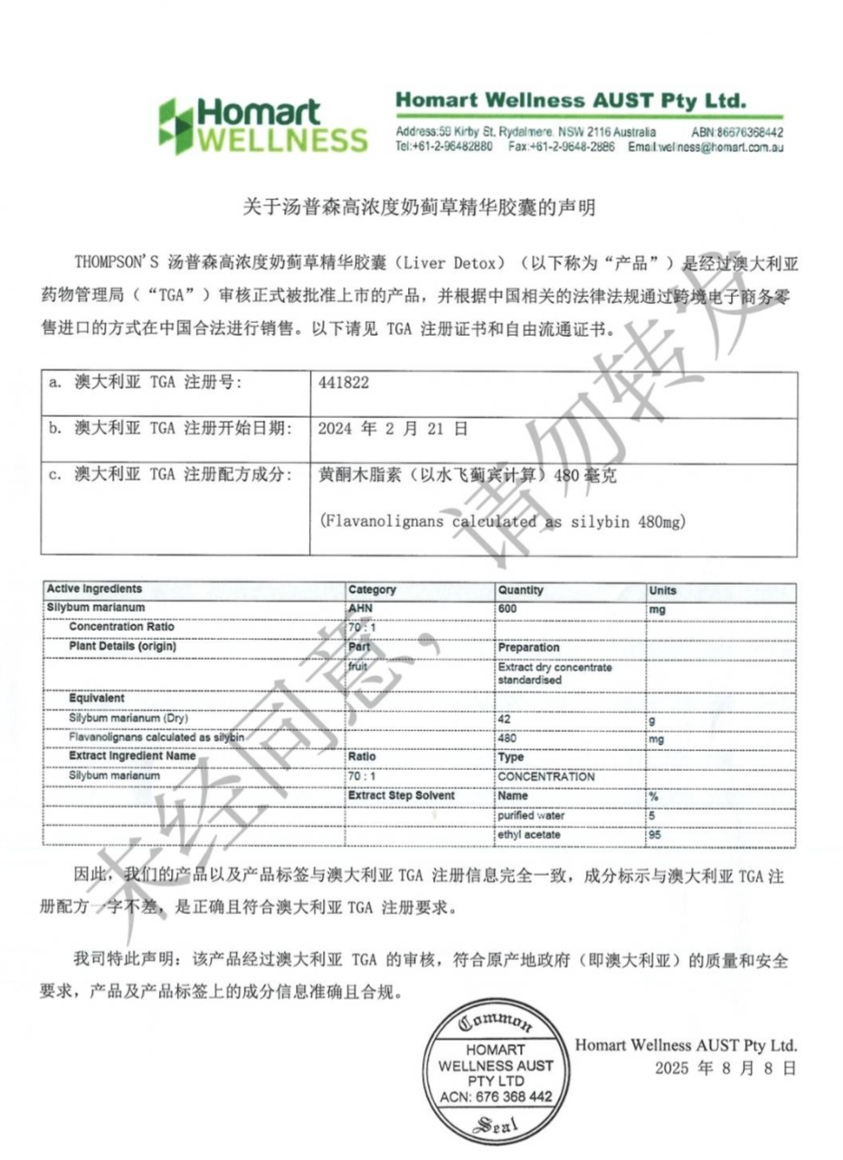 记者曾向汤普森客服反馈上述检测结果,客服坚称产品成分含量没问题,并且发来澳洲公司关于产品的声明,显示产品在澳大利亚药物管理局(TGA)注册审核,注册配方成分中,黄酮木脂素(以水飞蓟宾计算)含量是480毫克。