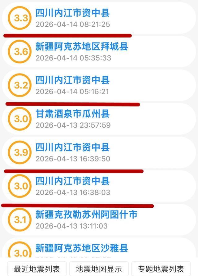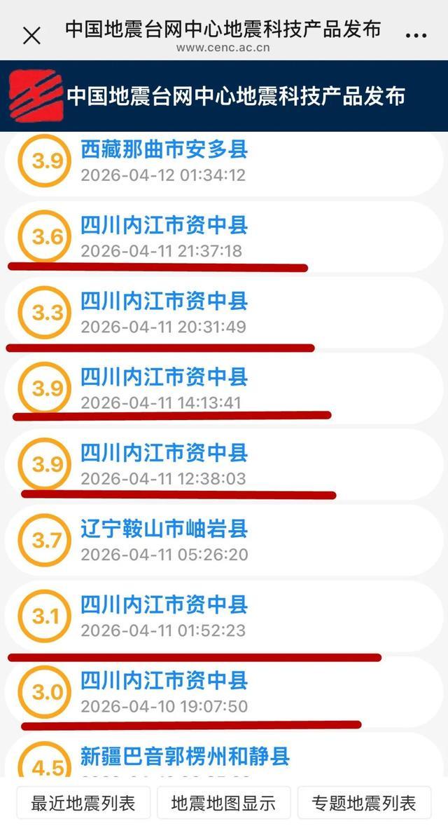 根据中国地震台网中心历史记录显示,从4月10日到发稿前,四川省内江市资中县境内连续发生15起地震,并且震感明显。对此,许多网友担心:为什么会连续发生这么多起地震?这是否为大震来临的先兆?