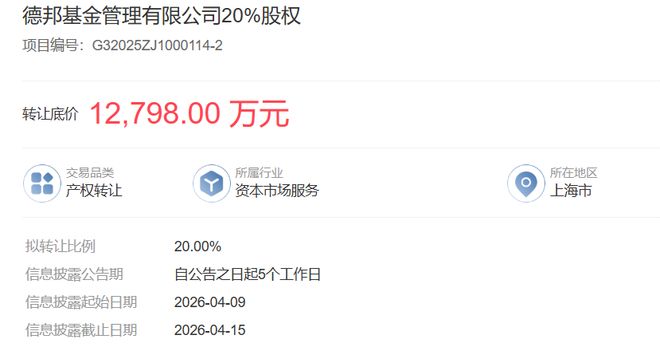 浙江产权交易所信息显示,此次浙江土畜集团转让德邦基金20%股权的信息公示期为4月9日至4月15日。值得注意的是,第一大股东德邦证券尚未明确表示放弃优先购买权,其后续是否受让,将直接影响德邦基金的股权结构走向。