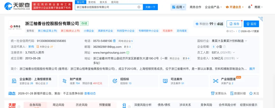 宋柚汁为浙江柚香谷控股股份有限公司旗下的产品,天眼查显示,浙江柚香谷控股股份有限公司成立于2013年5月,注册资本3750万元,法定代表人为宋伟,同时也是公司背后实际控制人,持有21.5%的股份。