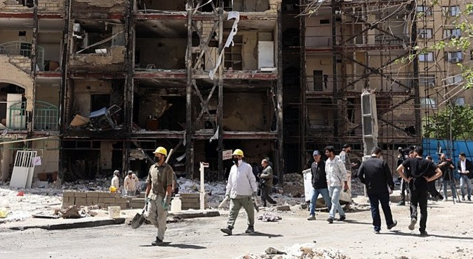 4月14日,工人在德黑兰一处住宅区清理瓦砾。