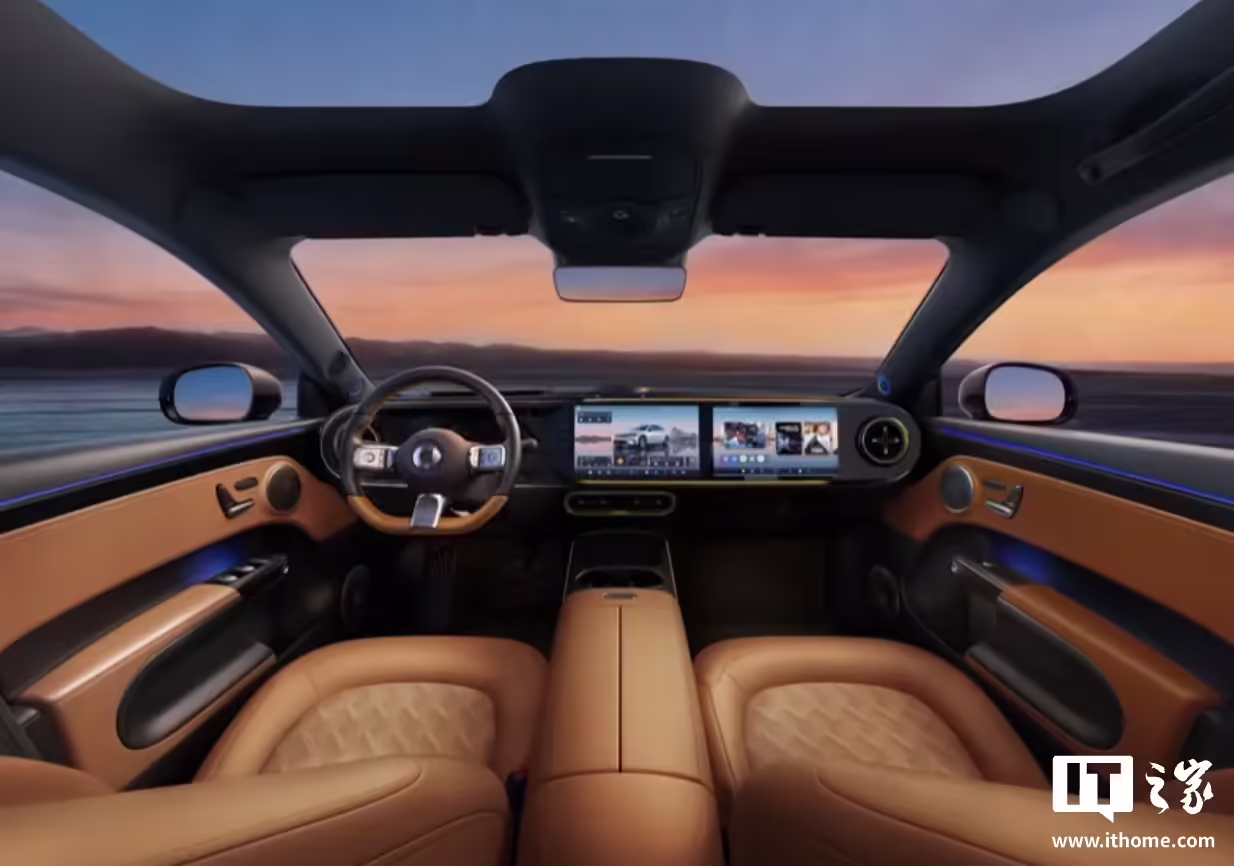 内饰方面,精灵 6 号提供格律黄、玄影黑和原野棕三种内饰供选择,其使用双联屏中控,匹配飞碟状悬浮式升降扬声器、7.1.4 布局森海塞尔典范音响系统,采用零压一体式运动座椅。