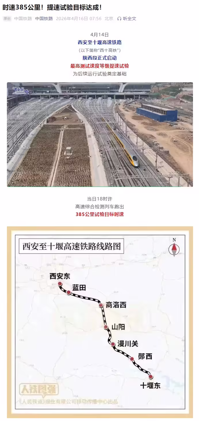 据中国铁路官方,4 月 14 日,西安至十堰高速铁路(以下简称“西十高铁”)陕西段正式启动最高测试速度等级提速试验,为后续运行试验奠定基础。当日 18 时许,高速综合检测列车跑出 385 公里试验目标时速。