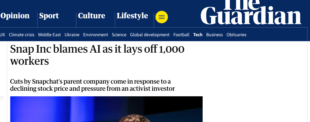 4月16日消息,据The Guardian报道,社交媒体公司Snap发布内部备忘录,宣布启动一项重大战略裁员计划,涉及约1000名团队成员(占其全职员工总数的16%),同时关闭超过300个未填补的职位空缺。该公司明确表示,此次裁员与组织优化是“为应对人工智能技术快速发展带来的行业变革”。