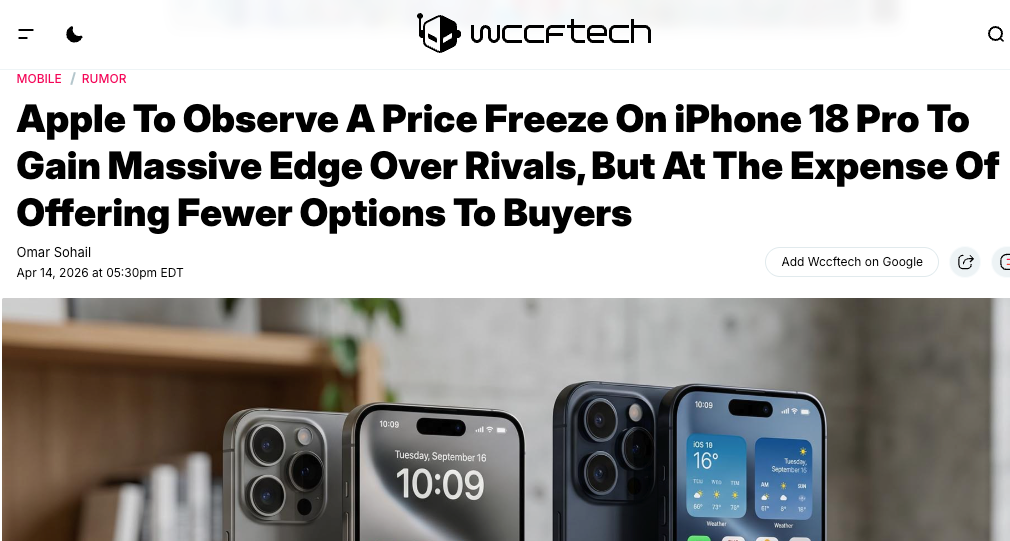 4月16日消息,据科技媒体Wccftech报道,苹果公司对即将发布的iPhone 18 Pro及iPhone 18 Pro Max机型采取“价格冻结”策略,维持现有定价水平以应对高端智能手机市场的激烈竞争。