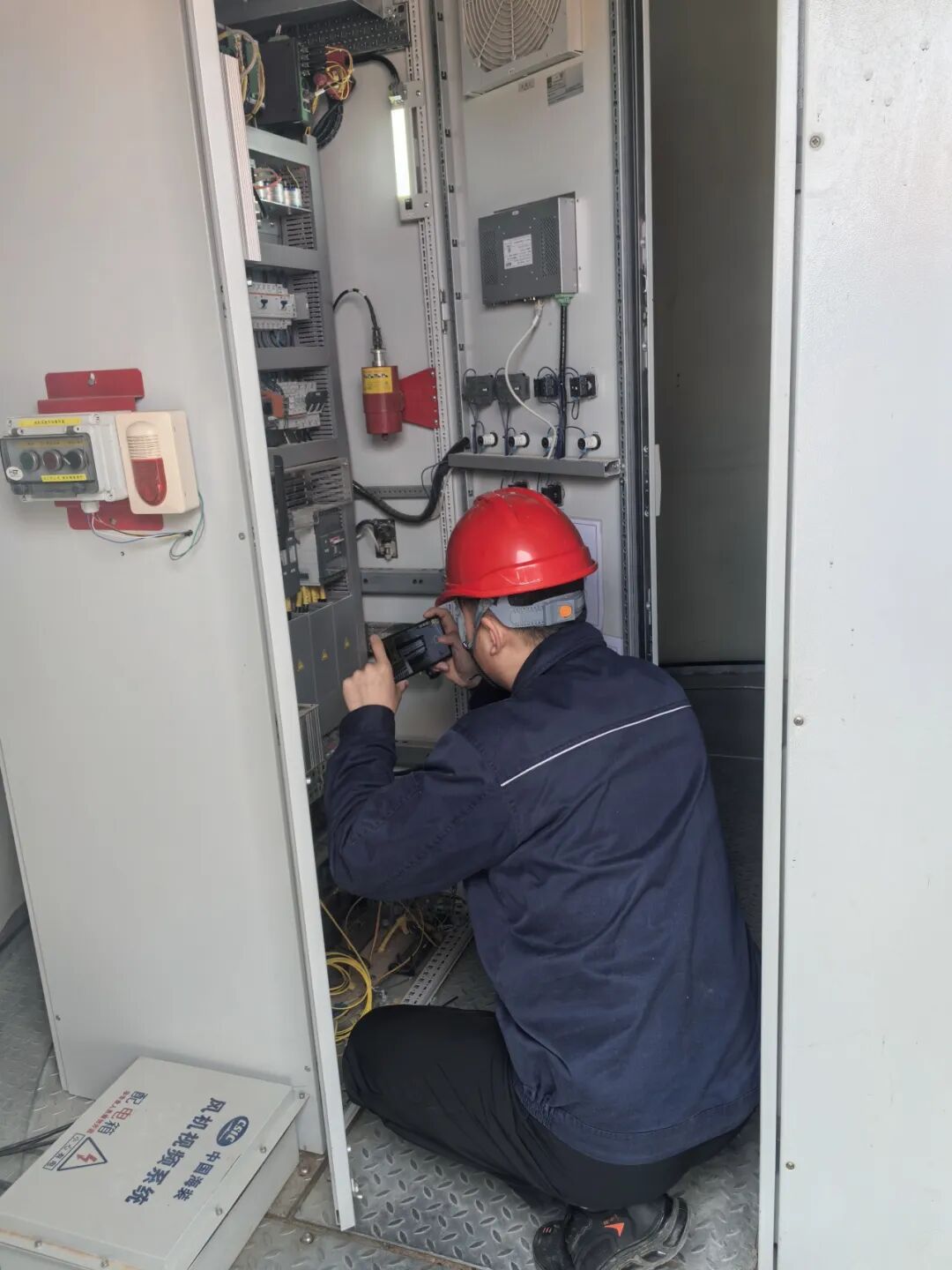 所属各中心生产运维人员系紧安全带登上风机机舱,细致排查齿轮箱、发电机等核心部件,逐段检查线路绝缘状况,紧固各类接线端子;地面人员则手持红外热成像仪,携带清洁工具,对光伏阵列开展“地毯式”的巡检,及时清理组件表面积尘、排查热斑隐患,同步检修汇流箱、逆变器等关键设备。