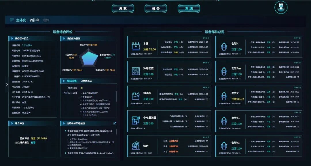 依托高精度三维模型,深度融合设备台账、历史运检记录、实时监测等全维度数据,为设备构建了逼真的“数字分身”。