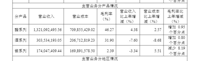 数据显示,报告期内,公司仅醋系列产品实现增长,全年营收13.21亿元,同比增长4.38%,对应销量22.8万吨;而酒系列产品与酱系列产品则双双下滑,分别实现营收3.04亿元、1.74亿元,同比下降7.60%、3.34%,销量分别为8.4万吨、3.3万吨。
