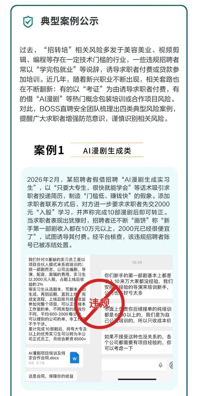 从此次披露的案例来看,“招转培”相关骗局正在借新概念、新职业不断翻新外包装,但核心路径并没有改变:先借“AI漫剧生成”“带货直播”等热门岗位吸引求职者关注,再在后续沟通中以培训、合作项目或考证为名,引导求职者付费。