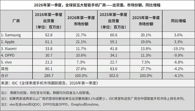 4月15日,IDC最新发布的《全球季度手机跟踪报告》初步数据显示,2026年第一季度(1Q26),全球智能手机出货量同比下降4.1%,至2.897亿部,这打破了自2023年年中以来市场连续十个季度的增长势头。对比来看,2025年同期全球智能手机出货量为3.049亿部,本季度行业出货规模同比缩减1520万部,市场下行态势凸显。