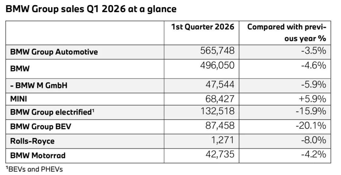 当地时间4月14日,宝马集团发布2026年第一季度全球交付数据。数据显示,该集团旗下宝马、MINI、劳斯莱斯三大汽车品牌第一季度全球累计交付量达56.57万辆,同比下降3.5%。