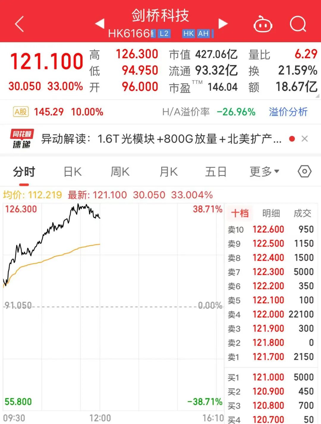 其中,源杰科技上午股价超越贵州茅台,成为A股新的“股王”。剑桥科技涨停,其H股上午大涨33%。