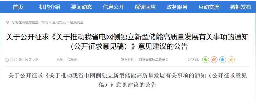 4月16日,海南省发改委发布《关于推动我省电网侧独立新型储能高质量发展有关事项的通知(公开征求意见稿)》,拟从项目备案、电网接入、建设时限、退出机制等方面作出系统规范,征求意见时间为4月16日至4月30日。