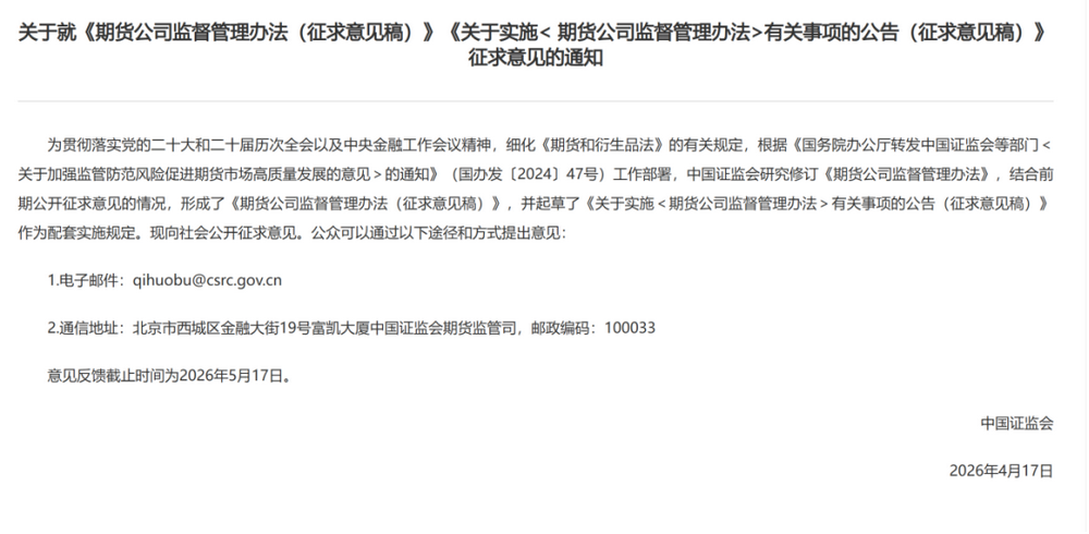 4月17日,证监会就《期货公司监督管理办法(征求意见稿)》(以下简称征求意见稿)及配套实施规定公开征求意见。