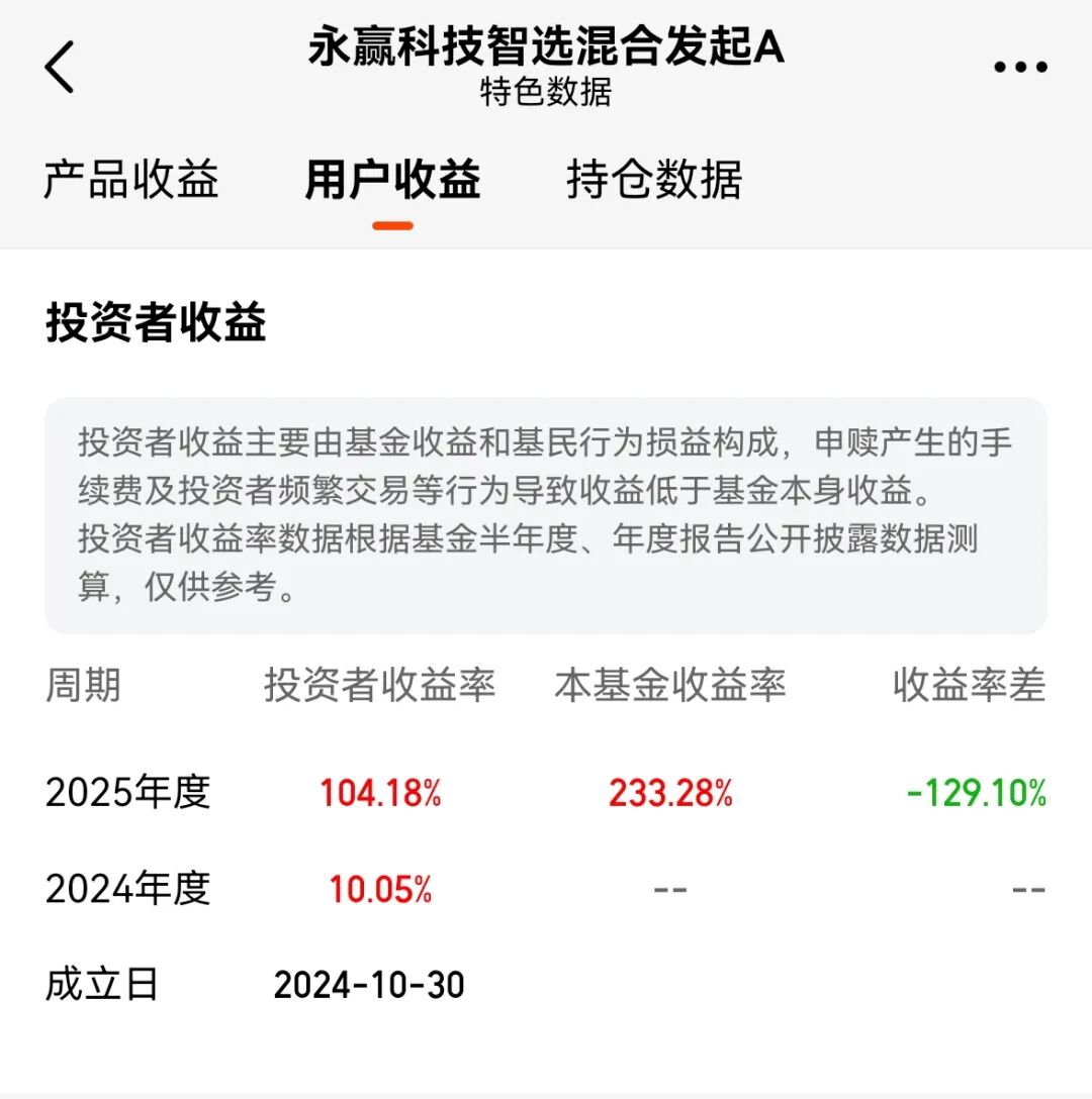以去年的冠军基金——永赢科技智选为例,该基金的特色数据披露中增加了“投资者收益”一栏。天天基金称,投资者收益主要由基金收益和基民行为损益构成,申赎产生的手续费及投资者频繁交易等行为导致收益低于基金本身收益。投资者收益率数据根据基金半年度,年度报告公开披露数据测算,仅供参考。