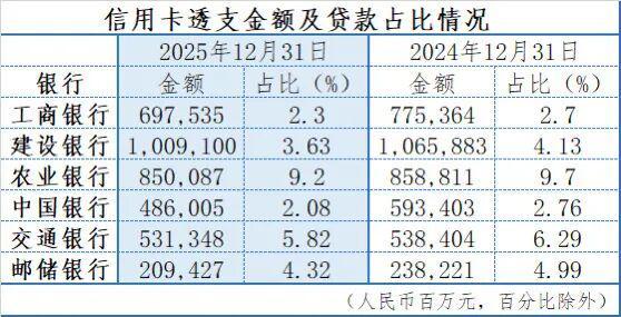央行数据显示,2025年信用卡业务仍在“缩量”。年报数据也显示,去年六家国有大行贷款结构中“信用卡透支”余额及占比均有下降。