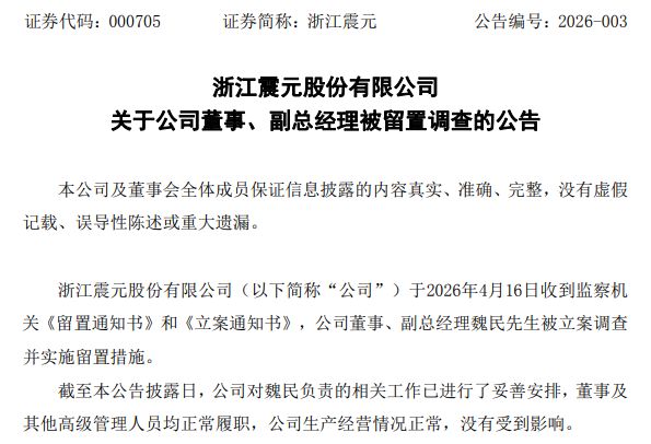 近日,浙江震元(000705.SZ)公告称,公司于2026年4月16日收到监察机关《留置通知书》和《立案通知书》,公司董事、副总经理魏民被立案调查并实施留置措施。截至公告披露日,公司尚未知悉调查的进展及结论。