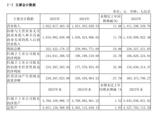 近日,会稽山发布2025年年报,报告期内,该公司实现营业收入18.22亿元,同比增长11.68%;归母净利润2.45亿元,同比增长24.7%,主要系销售收入增加、毛利率上升等影响所致。