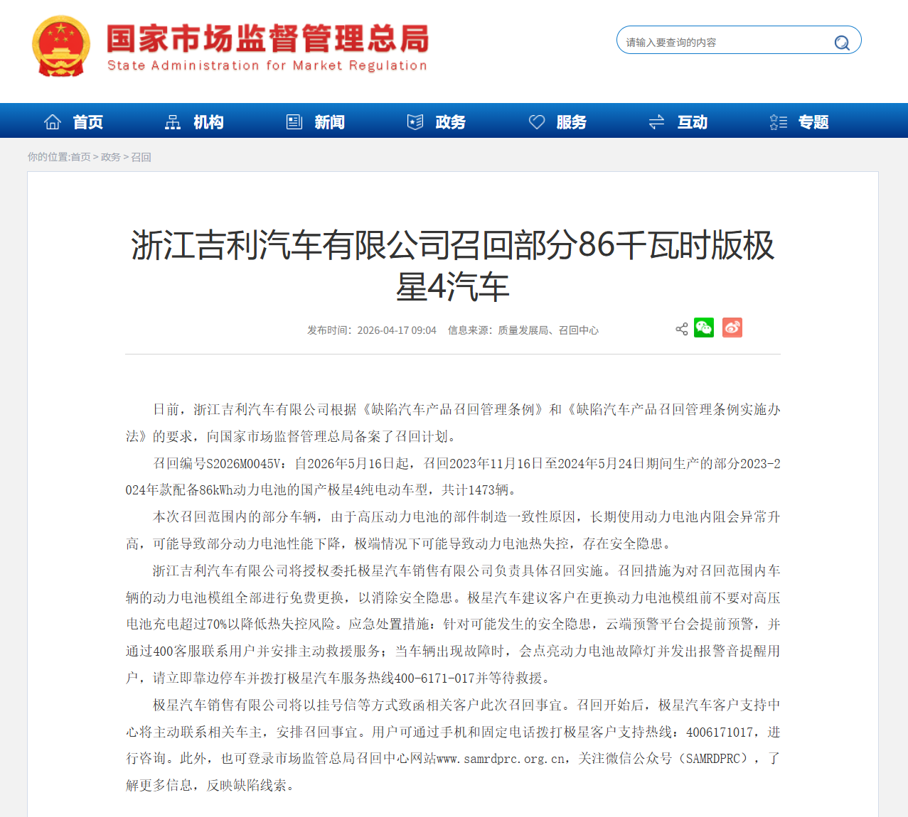 召回编号S2026M0045V:自2026年5月16日起,召回2023年11月16日至2024年5月24日期间生产的部分2023-2024年款配备86kWh动力电池的国产极星4纯电动车型,共计1473辆。