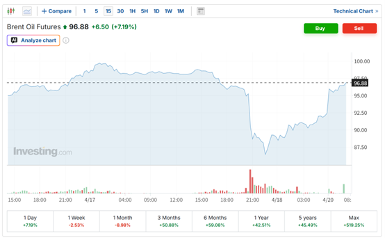 (布伦特原油期货15分钟走势图 来源:英为财情)