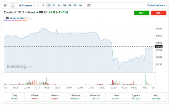 (WTI原油期货15分钟走势图 来源:英为财情)