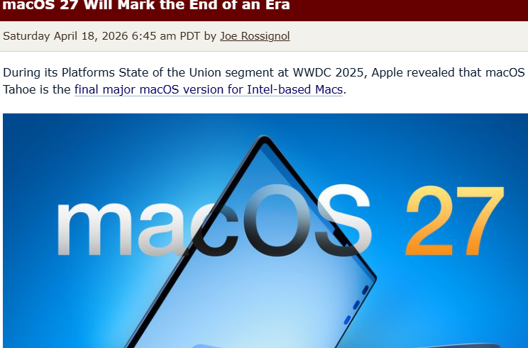 4月19日消息,据外媒macrumors报道,苹果此前宣布,macOS 26 Tahoe是最后一个支持英特尔架构Mac的正式版系统,下一代macOS 27 将仅支持苹果自研芯片。