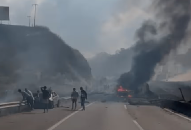 爆炸发生后,油罐车内燃油飞溅到公路和路边丛林中,导致火势蔓延,现场浓烟滚滚。