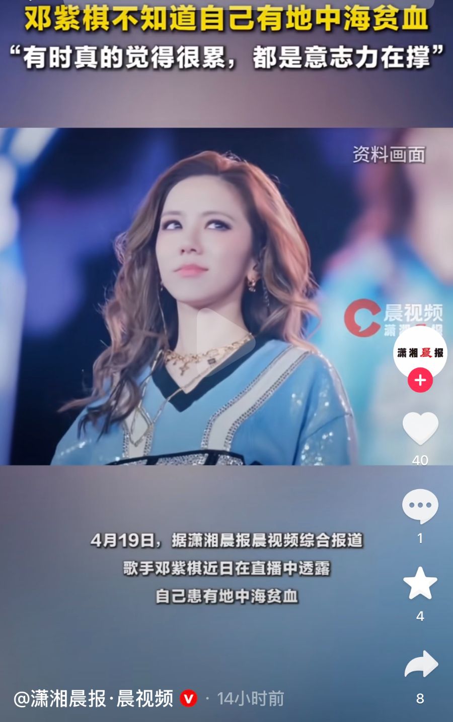 近日,歌手邓紫棋近日在直播中透露,自己患有地中海贫血。邓紫棋表示,直到母亲告知其病情,她才弄清自己长期感觉疲倦的根源,“我巡演了153场,真的很佩服自己,原来身体上有这些状况,在舞台上都是意志力在撑”。