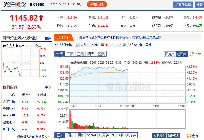 4月20日,光纤概念股再次爆发。截至上午11时30分,光纤概念(BK1660)板块指数报1145.82点,盘中涨幅最高超3%。