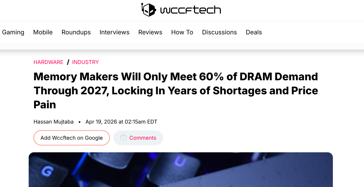 4月20日消息,据Wccftech报道,全球动态随机存取存储器(DRAM)市场近期呈现供应紧张、价格持续上涨的运行态势。受产能扩张受限、人工智能产业带动高带宽内存(HBM)需求激增等多重因素影响,业内预计内存芯片短缺局面将持续至 2027 年前后,市场供需关系有望在 2028 年逐步恢复平衡。